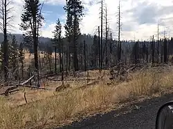 The Fremont Forest region is listed as part of the Mazama ecoregion due to high amounts of Mazama tephra covering the landscape as a result of its catastrophic eruption 7,620 years ago that resulted in the formation of Crater Lake.[9][10] Fremont ecology is at once fragile and robust, with dominant trees including ponderosa and lodgepole pines, juniper, willow in wetter areas, and occasional firs in some higher elevations[11] as well as over 925 vascular plant species.[12] Examples of herbaceous plants and shrubs include Nootka rose, biscuit root, bitterroot, ipos (wild carrot), gooseberries, service berries, wild strawberries, lily bulbs, and, in wetter areas, camas, wokus (yellow pond lily), and cattails.[13][14][12] The Fremont area differs from the Winema area in that it has slightly less tree diversity. This is due to two primary factors: the Cinema encompasses a greater elevation range, and receives more precipitation, due to its location on the east slopes of the Cascades, which provides alpine and subalpine environments.