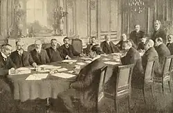 Between July and August 1908, Cardinal Merry del Val, Secretary of State of Pius X, consulted with several French prelates to coordinate the response. A document was drafted by four clergymen, backed by Rome, to decide on "the approach to be adopted when confronted with the dual proposal aimed at countering the actions of fathers in case of violation of academic neutrality": Cardinal Lecot, the Archbishop of Bordeaux; Cardinal Coullié, the Archbishop of Lyon; Cardinal Luçon, the Archbishop of Reims; and Cardinal Andrieu, the Bishop of Marseille.[16] In August 1908, the Déclaration des cardinaux, archevêques et évêques de France aux pères de famille de leur pays (Declaration of the Cardinals, Archbishops, and Bishops of France to the Fathers of their Country) was sent to metropolitan bishops for their signatures and those of their suffragan bishops. It marked a departure from the autonomy of the French episcopate during the separation debates by asserting the preponderance of the Vatican.[6]