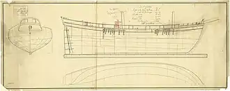 Suffisante was built with copper sheathing, including the pegs.[1] By 30 November 1793 Suffisante was under the command of enseigne de vaisseau non entretenu Berrenger and stationed at Le Havre. From there she cruised to protect the fishermen working between Dieppe and Cap d'Antifer.[4] Between 9 February 1794 and 3 August now sous-lieutenant de vaisseau Berrenger sailed Suffisante on cruises, escorted convoys between Dieppe and Cancale, sailed into the Atlantic, returning to Rochefort, and then sailed from Rochefort to Brest.[5]