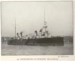 Marseillaise, named after the French national anthem,[7] was authorized in the 1898 Naval Program and was ordered from the Arsenal de Brest on 19 June 1899. The ship was laid down on 10 January 1900, launched on 14 July 1900, and completed in October 1903.[8] The cost of her construction was 22,031,750 francs. Marseillaise was initially assigned to the 1st Cruiser Division (1re Division de croiseurs) of the Northern Squadron. The ship carried President of France Emile Loubet to Naples, Italy, for a state visit in April 1904 and was then transferred to the Light Squadron (Escadre légère) of the Mediterranean Squadron in October. By September 1905, she was flagship of Rear Admiral (Contre-amiral) Paul Campion, commander of the squadron, and remained as such until she was briefly placed in reserve in July 1907.[9]