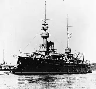 The Northern Squadron remained unchanged for 1901, apart from the addition of Hoche.[20] During the fleet maneuvers that year, the Northern Squadron steamed south for joint maneuvers with the Mediterranean Fleet. The Northern Squadron ships formed part of the hostile force, and as it was entering the Mediterranean from the Atlantic, represented a German squadron attempting to meet its Italian allies. The exercises began on 3 July and concluded on 28 July. In August and September, the Northern Squadron conducted amphibious assault exercises. On 28 August, they escorted a group of troop ships from Brest to La Rochelle. The ships conducted a simulated bombardment of the port, neutralized the coastal defenses, and put some 6,000 men ashore.[21] On 9 March 1902, Amiral Baudin, was transferred to the Reserve Squadron in the Mediterranean Fleet,[3] along with Carnot, and Hoche .[22] She was briefly recommissioned to replace the old ironclad Couronne during a re-boilering before being returned to reserve status on 7 November 1904. She was placed in special reserve at Toulon on 25 April 1907, then decommissioned on 15 May 1908. Following her removal from the naval register on 6 June 1909, she replaced Var as a barracks ship. Amiral Baudin was condemned on 31 October 1910, placed for sale on 1 August 1911, and sold to a M. Benédic and broken up.[3]