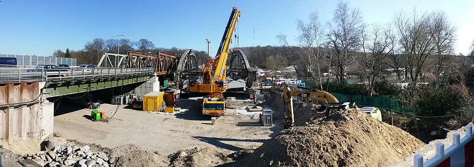The construction of the new bridge involved pre-assembly at the southern port of Spandau and transportation to its destination via pontoons on the Havel River after the demolition of the old bridge.[24] In September 2015, the components for the pre-bridge arrived by truck, as delivery by ship was not possible due to low water levels.[35] The pre-bridge was assembled on site from October 10, 2015.[36] The arches that linked the riverbanks were reconnected to the banks on April 16, 2016.[37] Another crucial step occurred on June 3, 2016, when the 400-ton center section, known as the Stromfeld,[38] was transported from the upper harbor of the southern harbor north of the Schulenburgbrücke to the Freybrücke and then lifted into place.[39] On June 4, welding began to anchor the lifted center section of the bridge. On both days, the Havel was closed to traffic in this section. Initially, traffic clearance was targeted for November 1, 2016,[40][41] but weather conditions prevented the final asphalt and marking work.[42]