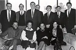 Frieda Garcia (front row, third from the left) in the mid 1980s meeting with Boston mayor Raymond Flynn and other city officials.