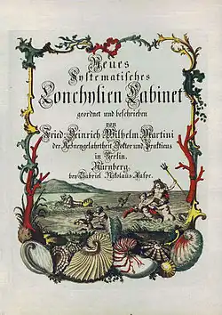 Martini practised medicine in Berlin.[1] In 1769, he began the colour-illustrated shell book Neues systematisches Conchylien-Cabinet, published by Gabriel Nikolaus Raspe at Nürnberg. He died following the publication of the third volume, after which the series was continued by Johann Hieronymus Chemnitz (1730–1800), who added eight volumes between 1779 and 1795. Because these volumes did not use the binomial system, the species names introduced are not considered valid.[2][3] However, the specimens illustrated often became type specimens, because subsequently others referred to them when publishing valid descriptions.[4] His shell collection was sold after his death but is now lost, probably deliberately disposed of in the 1970s.[4]