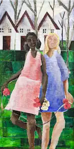 Friends is a 2011 mixed media collage by artist India Cruse-Griffin, which depicts two girls, one wearing a pink dress and the other a blue dress, holding flowers and standing in front of three white houses. The work, which measures 21.25" x 11.25", framed, is made from collaged paper gathered from magazines, upon which Cruse-Griffin then paints, often allowing the underlying magazine paper to show through.[1][2] While her subjects are often clear and straightforward, this collage technique serves as a reminder of the accumulation of lived experience.[1][2]
