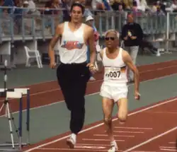 During competition he was guided by a sighted runner with a short rope tethered to their wrists, running in the outer lane to avoid getting in the way of other competitors.[4]: 10