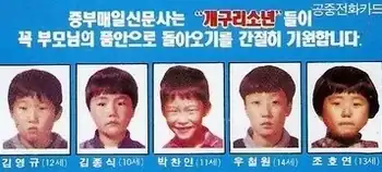 The Frog Boys (Korean: 개구리소년, Gaegurisonyeon) were a group of five boys who were murdered while trying to catch salamander eggs in Daegu (대구). The incident attracted national attention, leading to a massive manhunt and extensive media coverage. The case remains one of South Korea's most infamous unsolved crimes.