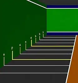 The falta line is located in the fourth square, while pasa is located in the seventh square; both lines are 15 cm wide. In the Olympic version, the falta is in the third square and the pasa on the fifth square.