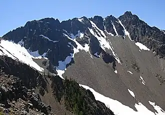 The history of the formation of the Cascade Mountains dates back millions of years ago to the late Eocene Epoch.[6] With the North American Plate overriding the Pacific Plate, episodes of volcanic igneous activity persisted.[6] In addition, small fragments of the oceanic and continental lithosphere called terranes created the North Cascades about 50 million years ago.[6] Frosty Mountain is composed of vertically thrusted metasedimentary rock from the ancient Methow Ocean.[1]