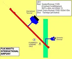 The air field was constructed by Seabees of the 1st Construction Battalion with assistance and labor of the U. S. Army 147th Infantry Regiment.[3] It was intended as a World War II heavy bomber field, and had three coral-surfaced runways. In the late 1970s, it was expanded to permit jet aircraft to use the runways. Fuaʻamotu is now suitable for up to Boeing 767 size aircraft, but remains closed to larger jets (e.g. Boeing 747s).