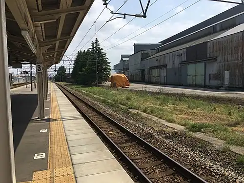 Fukuoka Station (福岡駅, Fukuoka-eki) is a railway station on the Ainokaze Toyama Railway Line in the Fukuoka neighbourhood of the city of Takaoka, Toyama Prefecture, Japan, operated by the Ainokaze Toyama Railway, which is a third-sector operator. This station is named after Fukuoka, Toyama, not the city of Fukuoka in Kyushu, the main station of which is named Hakata.
