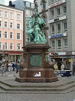 Therefore, the Lessing Monument is located in the center of the square. It was created by Fritz Schaper and erected in 1881. On 18 June 1944 the monument was hit by a bomb and it fell from its pedestal. In 1955 it was erected again.[2]