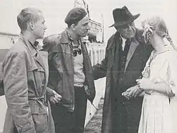 L–R: Gösta Ekman, Ingmar Bergman, Victor Sjöström, and Lena Bergman during the filming of Wild Strawberries (1957).