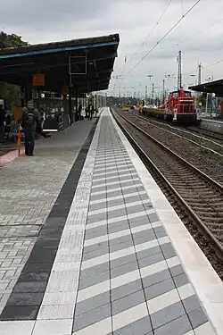 New platform edge on track 2 completed in August 2010: the shaded edge draws attention to the danger of ICE trains passing at 200 km/h.