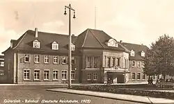 Gütersloh‘s original station building was built between 1845 and 1847 by the Cologne-Minden Railway Company[4] at the end of today's Kökerstraße. Two side wings were added in 1876/77 and the Königliche Eisenbahndirektion Hannover (railway division of the Prussian state railways of Hanover) built another extension at the turn of the century. After the neo-classical entrance building was demolished for the quadruplication of the Hamm–Minden line, Deutsche Reichsbahn-Gesellschaft (DRG) opened a new monumental station building at its present location on the street then called Queckwinkel on 21 December 1925. The extensive rebuilding of the extensive rail facilities, which replaced all the level crossings with underpasses, was completed in 1930 with the opening of the new freight yard beyond the freight tracks on Langer Weg. The ticket hall and the south wing (with the ticket office, express freight and baggage handling facilities) were damaged by air raids on 14 March 1945 and blown up by American troops in April 1945. For about six years it was necessary to buy tickets and to despatch baggage a temporarily constructed shed on the station forecourt. Deutsche Bundesbahn (DB) incorporated the north wing, which was still-standing and included a station restaurant and waiting room, in the reconstruction. The new south wing was built on the foundations of the previous building as an extended building and reinaugurated on 3 October 1951. With the completion of the new entrance hall in a simpler form in 1953, today's station had taken form adjoining the eastern end of inner city.[5][6]