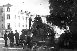 On 27th July the Germans decided to evacuate the Gęsiówka camp to Dachau. More than 400 inmates, incapable of marching, were shot....A column of about 4,000 Jews was marched off, but disappeared without trace. And now the Zośka battalion was standing in front of this camp. They remembered the Scouting Statute, which says that a scout is a friend to every other human being and a brother to every other scout. We all wanted to attack immediately....and since we had captured a couple of tanks, the situation was rather better than in the previous days. So four of us went back to "Radosław" [Jan Mazurkiewicz, commander of the insurgent forces in Warsaw's Wola district] to ask for permission. Radosław was a cautious man and shared the view that the fortified positions should not be attacked frontally. But he agreed on condition that the attacking force be small in number and be composed entirely of volunteers....We carried it off by surprise. Our tank was a great success because the Germans [in the camp] had no anti-tank weapons. After the main gateway was destroyed Felek's platoon moved in....[9]