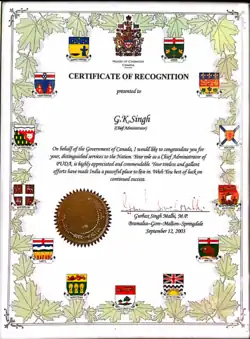 - Commendation Certificate by the House of Commons, Canada by MP Hon. Gurbax Singh Malhi