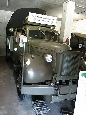The GMC AC 454 is a military truck build by the General Motors Company in the USA. It was used in World War II. The truck has a bridge construction. It has an onboard voltage of 12 volts. In the Swiss army the GMC AC 454 received the designation Lastw. Gl 3.5T 4x2 (off-road truck with 3.5t payload). The Swiss army used about 90 of these trucks. In 1971 a few GMC AC 454 were rebuilt by Pius Lang from the "Military-Motorfahrer-Gesellschaft des Kantons Zug" with Wood gas generator. The Wood gas generators were mounted on civilian trucks during the Second World War. Such a rebuilt GMC AC 454 is now located in the Zuger Depot Technikgeschichte (Zug depot of technical history).