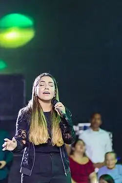 In 2020, she released the EP Hosana,[19] with the participation of Lukas Agustinho and Weslei Santos. During the Coronavirus pandemic, the singer performed a live solidarity on her YouTube channel with the participation of Mariana Valadão.[20] In partnership with the Federal Government of Brazil, all money raised from the live is donated to the Solidary Collection campaign, of the Pátria Volunária program, led by the first lady, Michelle Bolsonaro.[21] The live with the title "Juntos em Adoração" surpassed 5 million views, later the singer released an album with the same title and a podcast containing devotionals.[22] In the same year, the singer carried out several projects in partnership with international singers, releasing the single "Lugar Secreto" in Spanish, with Christine D'Clario,[23][24] also released two singles with Kim Walker-Smith,[25] "Teu Espírito" and "Seu Nome" é Amor" and another one with the American worship band, Elevation Worship, "Vida aos Sepulcros".