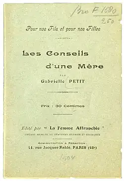 Gabrielle Petit (née Mathieu; November 26, 1860 – 1952), was a French feminist activist, anticlerical, libertarian socialist, and newspaper editor. Independent of any political party, she collaborated with trade unionists and Freethought activists. She founded the newspaper La Femme affranchie (The Emancipated Woman)[1] where she denounced prostitution. At conferences, she spoke about the emancipation of women, birth control, the evils of militarism, and support for workers' strikes.