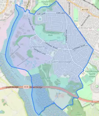 It is located in the South East Area of Ipswich and comprises the whole of Gainsborough Ward plus part of Holywells Ward,[1] both of which are electoral wards of Ipswich Borough Council.