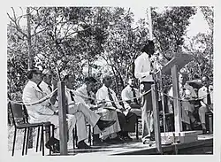 In the early 1970s, Yunupingu sang a song written by Ted Egan, called "Gurindji Blues", about the struggles of the land rights movement in the NT at the time.[22] Released on RCA Victor in 1971, the single features Vincent Lingiari of Gurindji strike fame, who introduces the recording in Gurindji, followed by a translation into English. Yunupingu also sings on the B side of the record.[23][24][25]