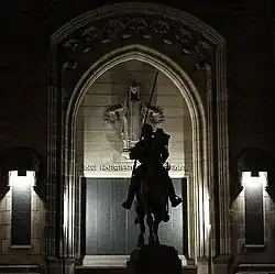 The tower also incorporated, on the ground floor, a war memorial, the foundation stone for which was laid by the Prince of Wales on 3 December 1924.[9] The war memorial took the form of a segmental arch containing a brass plaque commemorating the lives of local service personnel who had died in the First World War: it was surmounted by a statue depicting an angel of peace sculpted by the local sculptor, David Sutherland.[1] The completed war memorial was unveiled by Field Marshal Earl Haig on 4 October 1925.[10] An equestrian statue of a Border reiver, designed by Thomas Clapperton, was installed in front of the tower.[11]