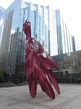 The abstract (geometric) welded steel sculpture is approximately 45 feet (14 m) tall and 27 feet (8.2 m) wide. It is painted red and weighs 14 tons.[1]