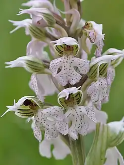 A galea is an overhanging, helmet-shaped, part of the flower[1][2] that protects the reproductive parts from precipitation, wind, or unwanted visitors. The galea is composed of one or more petals or sepals that have either fused or folded together. The name is taken from the same word for a Roman soldier's helmet. [3]