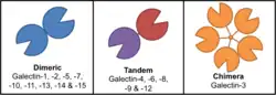 There are three different forms of galectin structure: dimeric, tandem or chimera. Dimeric galectins, also called prototypical galectins, are homodimers, consisting of two identical galectin subunits that have associated with one another. The galectins that fall under this category are galectin-1, -2, -5, -7, -10, -11, -14 and -15. Tandem galectins contain at least two distinct carbohydrate recognition domains (CRD) within one polypeptide, thus are considered intrinsically divalent. The CRDs are linked with a small peptide domain. Tandem galectins include galectin-4, -6, -8, -9 and -12. The final galectin is galectin-3 which is the only galectin found in the chimera category in vertebrates. Galectin-3 has one CRD and a long non-lectin domain. Galectin-3 can exist in monomeric form or can associate via the non-lectin domain into multivalent complexes up to a pentameric form.[3] This allows galectin-3 to bridge effectively between different ligands and form adhesive networks. The formation of multimers is concentration dependent. When Galectin-3 is at a low concentration it is monomeric and likely to inhibit adhesion. It binds to adhesion proteins such as integrins and blocks further binding to other cells or the extracellular matrix. When concentrations of galectin-3 are high it forms large complexes that assist in adhesion by bridging between cells or cells and the extracellular matrix. Many isoforms of galectins have been found due to different splicing variants. For example, Galectin-8 has seven different mRNAs encoding for both tandem and dimeric forms. The type of galectin-8 that is expressed is dependent on the tissue.[4] Galectin-9 has three different isoforms which differ in the length of the linker region.[4]