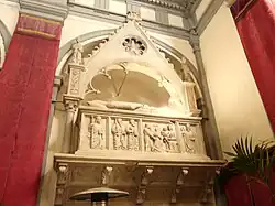 Inside the Church of San Remigio in Fosdinovo, there is the marble fourteenth-century funeral monument of Galeotto Malaspina, in which the deceased, as a Knight, is carved in the act of investiture in the presence of the Virgin, of Christ, of Saint John the Baptist, of Saint Anthony of Padua and Saint James the Apostle, the holy holders of the main orders of chivalry in the Middle Ages.[4]