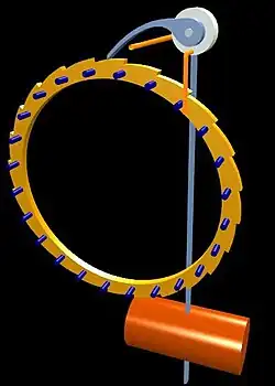 Galileo's escapement is a design for a clock escapement, invented around 1637 by Italian scientist Galileo Galilei (1564–1642). Galileo was one of the leading minds of the Scientific Revolution.[1] He was dubbed the founder of theoretical physics.[2] He is also credited with the invention of the celatone (a type of telescope) and the geometric and military compass.[3] Galileo's escapement was the earliest design of a pendulum clock. Since Galileo was by then blind, he described the device to his son Vincenzio, who drew a sketch of it. The son began construction of a prototype, but both he and Galileo died before it was completed.