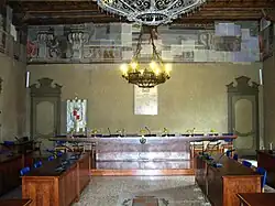 The main characteristic of the interior of the palace is a majestic stairway, featuring a starry sky on the ceiling, leading to the town council hall, in the upper floor. The hall is typically baroque, and is by far the most richly decorated in the building; it features a decorative bend on all four sides, just below the ceiling, with pictures of winged putti playing instruments. The walls feature baroque frescoes. The floor features a mosaic representing the coat of arms of the town. The entrance of the hall hosts a sculpture of Emilio Gallavresi, who was born and lived in the building and became a member of the Italian parliament as a member of the Italian Socialist Party; the sculpture was made by Enrico Pancera.