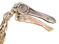 The delicate lower jaw, consisting of thin bones, was slender and shallow at the front, deepening towards the rear. The front of the mandible was shovel-like, resulting in a gap between the tips of the jaws when shut. The shovel-like shape was similar to that of the common seagull, and the lower beak may have had a shape similar to that of this bird. The retroarticular process at the back of the jaw (where jaw muscles attached that opened the beak) was well developed and consisted mainly of the angular bone. The surangular was the largest bone of the lower jaw, which is usual in theropods. The mandibular fenestra, a sidewards-facing opening in the lower jaw, was elongated and comparatively small. The lower jaw did not have a coronoid process or a supradentary bone, the lack of which is a common feature of beaked theropods (ornithomimosaurs, oviraptorosaurs, therizinosaurs and birds), but unusual among theropods in general.[1][23] The jaws of Gallimimus were edentulous (toothless), and the front part would have been covered in a keratinous rhamphotheca (horny beak) in life. The beak may have covered a smaller area than in North American relatives, based on the lack of nourishing foramina on the maxilla. The inner side of the beak had small, tightly packed and evenly spaced columnar structures (their exact nature is debated), which were longest at the front and shortening towards the back.[21][23][24]