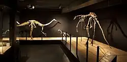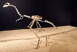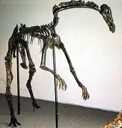 At the time it was named, the fossils of Gallimimus represented the most complete and best preserved ornithomimid material yet discovered, and the genus remains one of the best known members of the group. Ornithomimids were previously known mainly from North America, Archaeornithomimus being the only prior known member from Asia (though without a skull). Since the first discoveries, more specimens have been found by further Mongolian-led international expeditions.[1][8][5][6] Three of the Gallimimus skeletons (including the holotype) later became part of a travelling exhibit of Mongolian dinosaur fossils, which toured various countries.[9][10]
