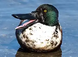 In 2001, palaeontologists Mark A. Norell, Makovicky, and Currie reported a Gallimimus skull (IGM 100/1133) and an Ornithomimus skull that preserved soft tissue structures on the beak. The inner side of the Gallimimus beak had columnar structures that the authors found similar to the lamellae in the beaks of anseriform birds, which use these for manipulating food, straining sediments, filter-feeding by segregating food items from other material, and for cutting plants while grazing. They found the Northern shoveller, which feeds on plants, molluscs, ostracods, and foraminiferans, to be the modern anseriform with structures most similar in anatomy to those of Gallimimus. The authors noted that ornithomimids probably did not use their beaks to prey on large animals and were abundant in mesic environments, while rarer in more arid environments, suggesting that they may have depended on aquatic food sources.[24] Makovicky, Kobayashi, and Currie pointed out that if this interpretation is correct, Gallimimus would have been one of the largest known terrestrial filter feeders.[17]