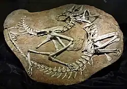 Fossil poaching has become a serious problem in Mongolia in the 21st century, and several Gallimimus specimens have been looted. In 2017, Hang-Jae Lee and colleagues reported a fossil trackway discovered in 2009 associated with a clenched Gallimimus foot (specimen MPC-D100F/17). The rest of the skeleton appeared to have been removed previously by poachers, along with several other Gallimimus specimens (as indicated by empty excavation pits, garbage, and scattered broken bones in the quarry). It is unusual to find tracks closely associated with body fossils; some of the tracks are consistent with ornithomimid feet, while others belong to different dinosaurs.[11][12] In 2014, a slab with two Gallimimus specimens was repatriated to Mongolia along with other dinosaur skeletons, after having been smuggled to the US.[13]