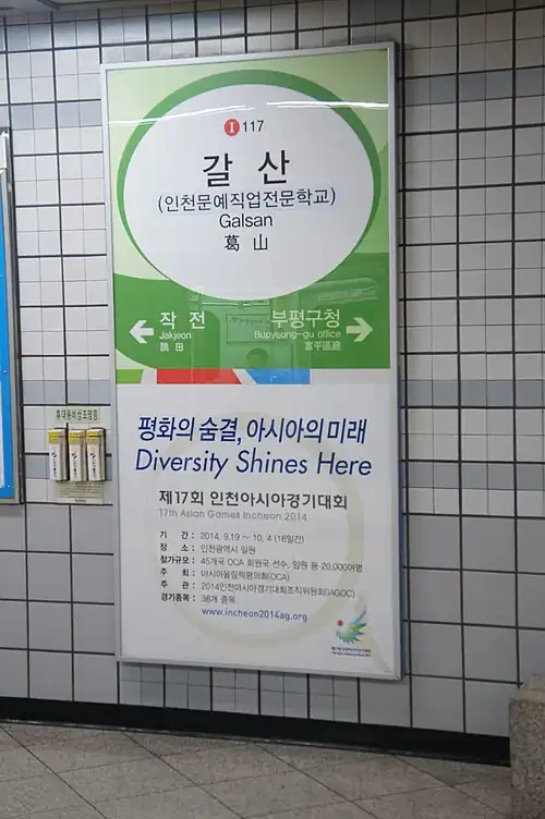 Galsan Station (Korean: 갈산역; Hanja: 葛山驛) is a subway station on Line 1 of the Incheon Subway in Bupyeong District, Incheon, South Korea.
