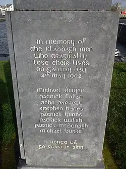 On 4 May 1902, eight fishermen from a nearby village lost their lives while sailing on Galway Bay, near Kilcolgan.[3][4] Seven (Patrick Folan, Patrick Burns, Patrick McDonagh, John Barrett, Michael Burke, Michael Dwyer and Stephen Hynes) drowned; Patrick Walsh swam to shore at nearby Kilcolgan, but died of exhaustion on the beach.[4] A fundraising campaign was organised for the families of the drowned fishermen.[5]