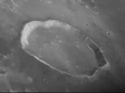 Gambart is a small lunar impact crater on the Mare Insularum, near the central region of the Moon. It is named after French astronomer Jean-Félix Adolphe Gambart.[1] It can be located to the south-southeast of the prominent ray crater Copernicus. In the past, the floor of Gambart has been flooded with lava, leaving a relatively flat surface surrounded by a smooth but somewhat polygon-shaped outer rim. To the southwest of Gambart is an area of hilly terrain deposited from ejecta during the Mare Imbrium impact, known as the Fra Mauro Formation.