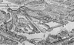 In 1859 the Navy decommissioned their last operations at Gammelholm, and the area came under redevelopment as a residential neighbourhood according to a masterplan created by Ferdinand Meldahl.[1] At the same time the Canal of Holmen was filled and converted into a prominent new street. Construction in the area began in 1861 and was completed in 1876.