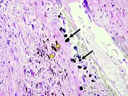 Gandy–Gamna nodules or Gandy-Gamna bodies, sometimes known as Gamna-Gandy bodies or Gamna-Gandy nodules, are small yellow-brown, brown, or rust-colored foci found in the spleen in patients with splenomegaly due to portal hypertension,[1] as well as sickle cell disease. They consist of fibrous tissue with haemosiderin and calcium deposits, and probably form due to scarring at sites of small perivascular haemorrhages.[2] They are visible on MRI scanning due to the presence of haemosiderin.[3]