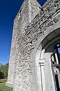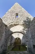 The stone church structure consists of a chancel, nave and tower. The tower rests on the west wall of the nave. The tower was presumably built in the late 13th century. The church was presumably abandoned as early as in the 16th century. The chancel and arch contain mural paintings. The church grounds and gardens were preserved in 1924 and are now a tourist destination.[4][5][6]