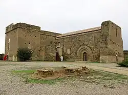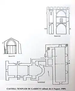 Gardeny Castle (Castell de Gardeny) is a 12th-century Romanesque fort built by the Knights Templar at Lleida. Located on a neighbouring hill, just over a mile away, from Lleida's main fortress, the Castle of La Suda, Gardeny defended the only accessible side of that castle. Although by the 20th century, the only buildings left standing were the palace and the church of Santa María de Gardeny, at right angles to each other, the castle grounds originally had several other buildings that were destroyed during the wars of the 17th and 18th centuries. Archaeological studies from 2005 show that the palace and church were originally constructed as two separate buildings, later joined by a corridor or sacristy.[1]