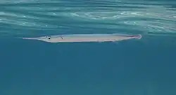 The garfish is a long and slender fish with a laterally compressed body, and grows to about 50 to 75 cm (20 to 30 in) in length. The jaws are elongated and armed with sharp teeth. The pectoral, dorsal, and anal fins are situated well back on the body and the latter two are similar in appearance. Positioning the fins so far back gives greater flexibility to the body. The lateral line is set low on the flanks. The colour of the body is bluish green with a silvery grey belly and the bones are green.[2][3] Garfish are pelagic fish which live close to the water surface. They eat small fish and have a migratory pattern similar to that of the mackerel, arriving a short time before the latter to spawn. Their association with mackerel has led to some older common names such as "mackerel guide" and "mackerel guardian".[4]