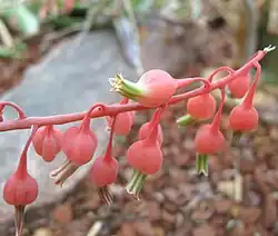 In spring, a stem up to 35 cm (14 in) long bears a row of 15-25 bell-shaped, bright pink and green flowers, which are unusually inflated.[2]