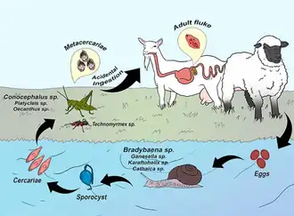 Eurytrematosis is a parasitic infection caused by the pancreatic trematode genus, Eurytrema.[16] This trematode genus primarily affects ruminants such as cattle and sheep, but has been known to infect humans as well.[17] The transmission cycle of eurytrematosis starts with eggs being excreted by an infected definitive host and being ingested by a terrestrial gastropod host. After ingestion, the eggs hatch and after several months, asexual sporocyst are created and start to produce cercariae, that are expelled into the environment by the first intermediate gastropod host. These cercariae are secreted through the mucus of the first intermediate gastropod host and are ingested by the second intermediate hosts, which is an insect species such as a grasshopper (Orthoptera) or an ant. The successful cercariae develop into mature metacercariae and wait for months within the second intermediate insect host. The transmission cycle is then completed when the second intermediate host is accidentally ingested by a ruminant, where the adult parasites are then able to reside in the bile ducts of the liver and the pancreatic ducts. In humans, accidental infection can occur through the consumption of contaminated water or food.