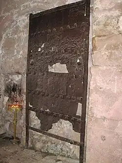 Only one half of the gate has survived. It is built into the wall of Gelati Monastery across from the tomb of Georgian King David IV.[6][7] Today, a leaf of this gate is fastened to the wall facing David I's grave in the yard of the monastery.[8][9][10]