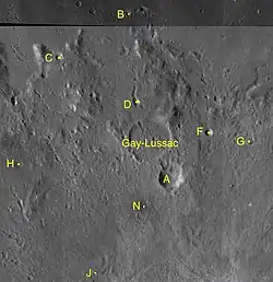 By convention these features are identified on lunar maps by placing the letter on the side of the crater midpoint that is closest to Gay-Lussac.