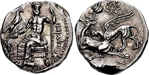 Coin of Ariarathes I. Obv: B’L GZYR (“Baal [of] Gaziura” in Aramaic), Baal seated. Gaziura mint. 333-322 BC